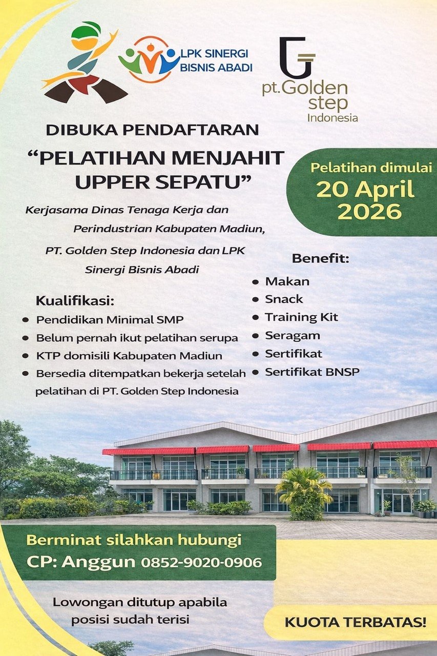 Sekolah Menengah Kejuruan (SMK) menginformasikan kepada siswa, alumni, serta masyarakat umum mengenai pembukaan pendaftaran pelatihan kerja yang diselenggarakan melalui kerja sama antara Dinas Tenaga Kerja dan Perindustrian Kabupaten Madiun, PT Golden Step Indonesia, dan LPK Sinergi Bisnis Abadi. Pelatihan ini bertujuan untuk meningkatkan kompetensi peserta di bidang industri manufaktur, khususnya pada proses produksi sepatu. Program…