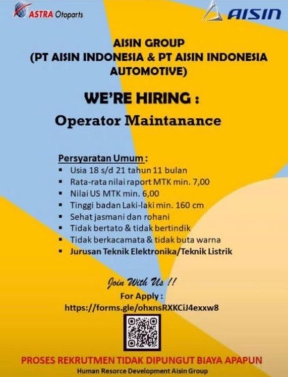 INFORMASI LOWONGAN KERJA – AISIN GROUP (Operator Maintenance)