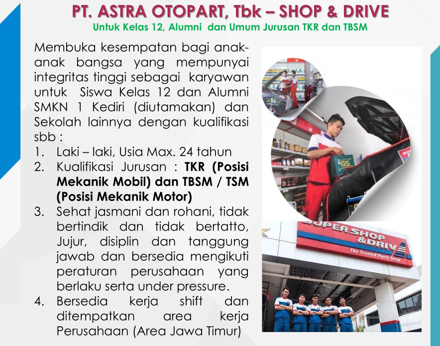 PT Astra Otoparts Tbk melalui jaringan Shop & Drive membuka kesempatan kerja bagi generasi muda yang berintegritas tinggi untuk bergabung sebagai karyawan. Lowongan ini terbuka bagi Siswa Kelas XII, Alumni, dan Umum, khususnya dari jurusan otomotif.